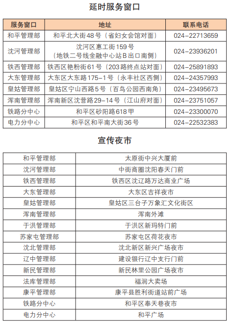延时窗口办理:和平、沈河、铁西、大东、皇姑、浑南管理部及铁路、电力分中心将周一至周五工作日服务时间由17时延长至18时30分,职工可在此期间办理公积金提取、贷款等业务。