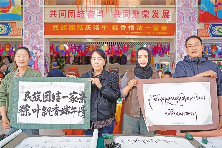图为市文联组织书法家到天马商贸市场与各民族商户一起过端午节。