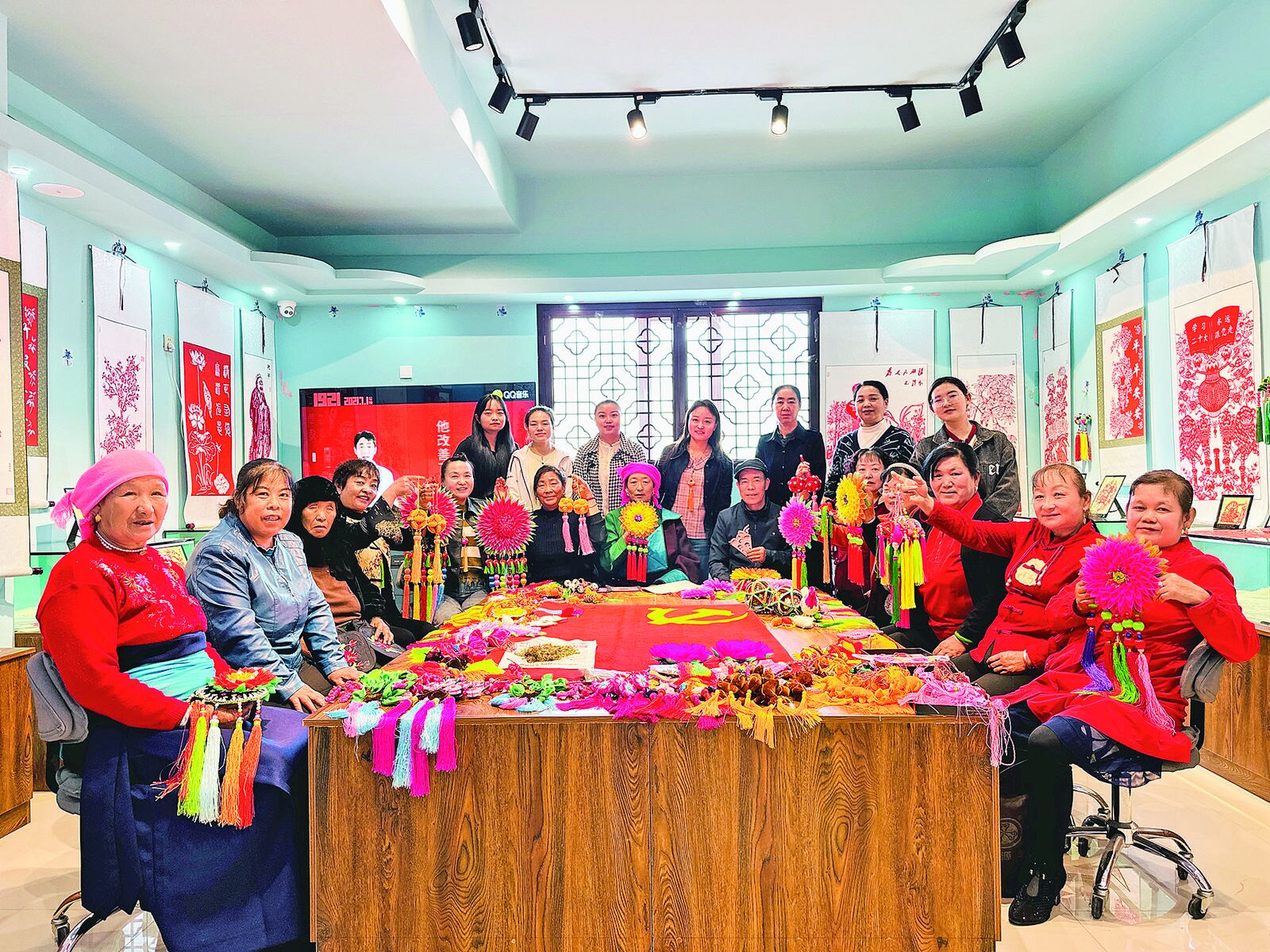 在社区“红石榴之家”一楼,由辖区孩子共同创作的“民族团结一家亲”水彩画和用黏土捏出的56个民族泥塑群像格外引人注目。走上二楼,身着各民族服饰的妇女围坐在“红石榴”手工作坊里一起刺绣,一旁非遗剪纸艺术第三代传承人杨成君正在教几个孩子剪纸。墙上,一幅幅温馨的照片,都在向每一位到访者无声述说着社区里各族群众相亲相爱的“幸福事儿”。