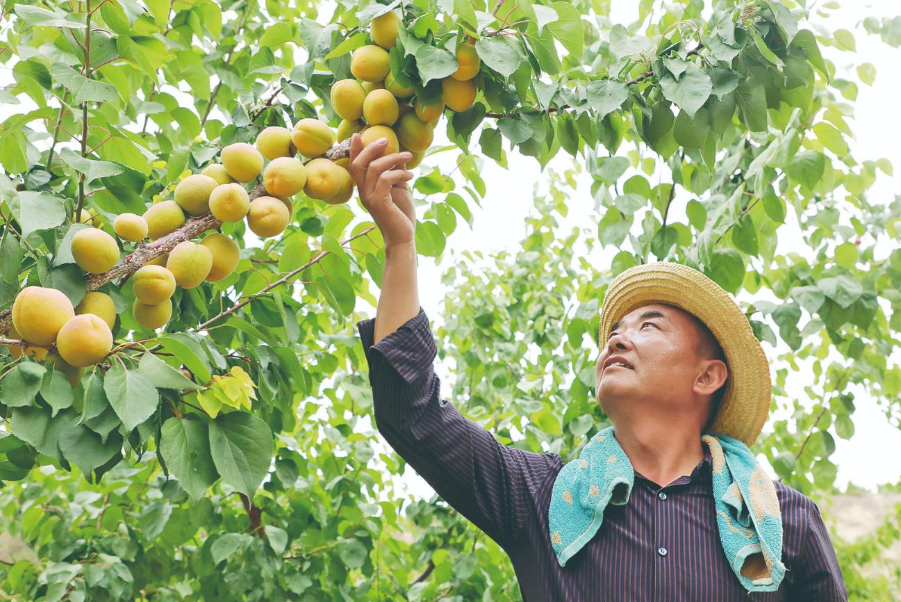 杏林间,一位头戴草帽、脖颈上搭着毛巾的中年男子正一手提着塑料袋,一手采摘成熟的大黄杏,时不时用毛巾擦拭一下额头的汗珠。
