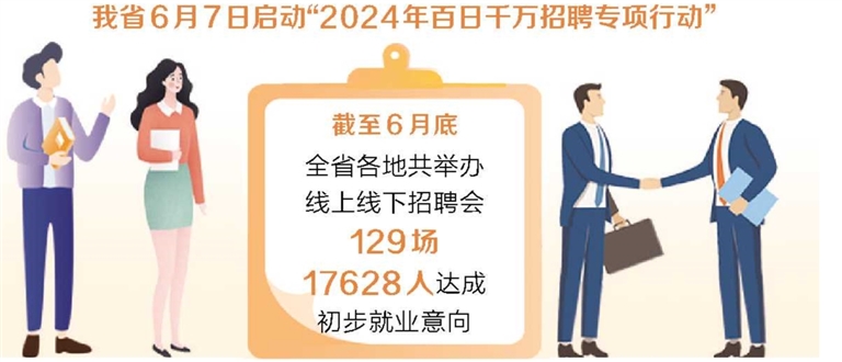 省人力资源社会保障厅有关工作人员介绍,6月7日我省启动了“2024年百日千万招聘专项行动”,截至6月底,全省各地共举办线上线下招聘会129场,共有5574家用人单位参会,发布岗位信息150138个,共有98221人投递简历、17628人达成初步就业意向。