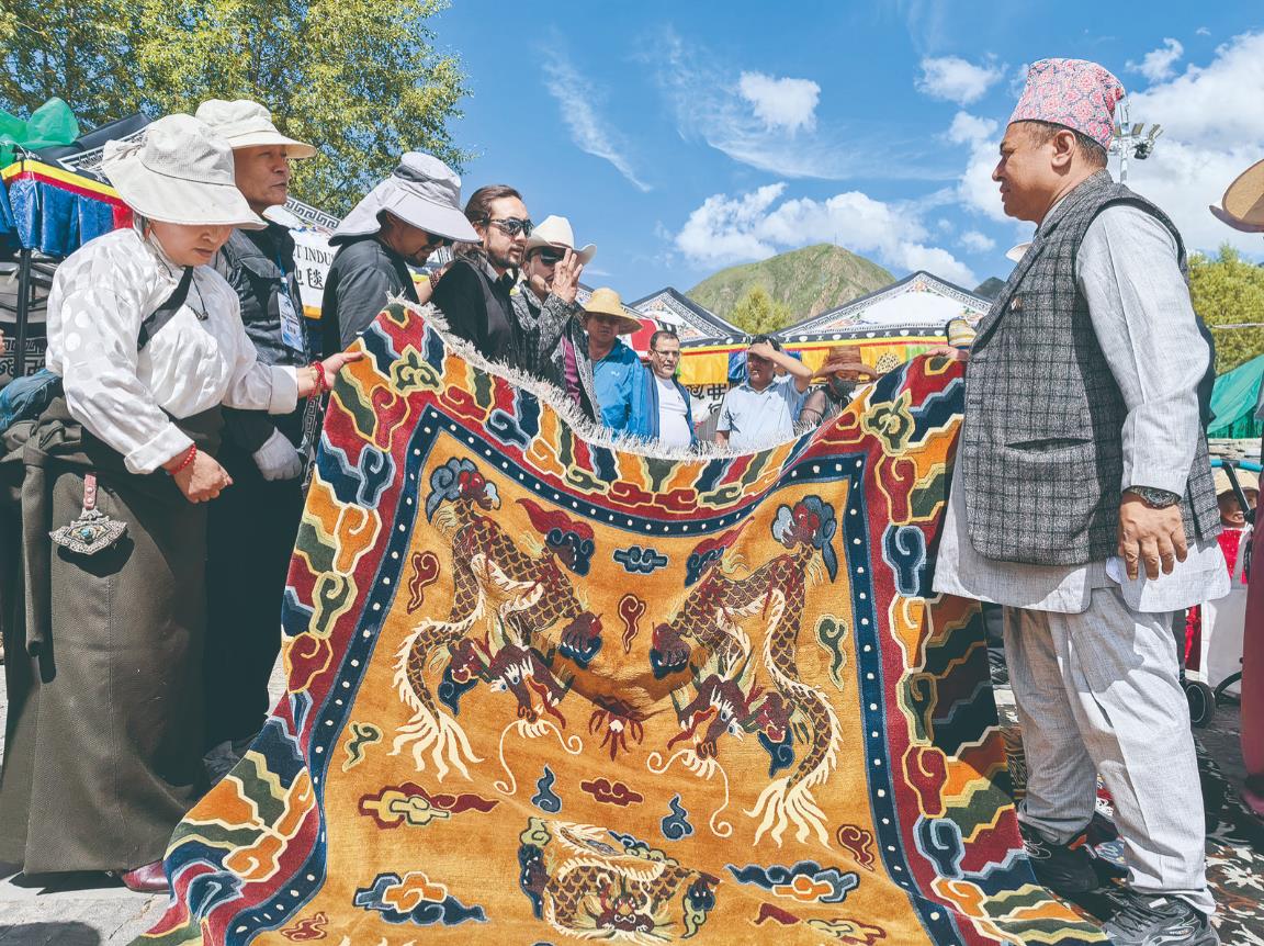 骄阳似火的天气,点燃购销热,展会现场人潮涌动、热闹非凡。各展位上,尼泊尔地毯、手工艺品、服饰等特色商品琳琅满目,吸引众多客商前来选购。此次展会还充分利用网络平台,开展了线上推广活动,实现线上线下融合互动,进一步扩大影响力和公众参与度。虽然大多尼泊尔商人与玉树本地消费者语言沟通不便,但这丝毫没有降低买卖双方的购销热情,大家纷纷拿出手机输入价格数字沟通购销意愿。
