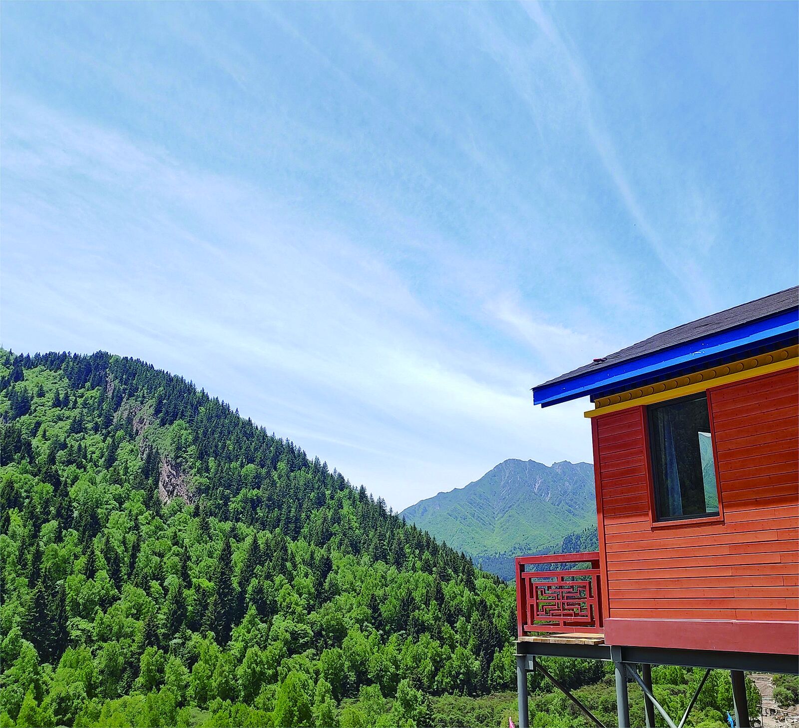 跟随“小木屋”翻过高山来到位于“云上群加露营”基地项目现场,仿佛走进油画世界。蓝天白云下,山间森林被微风吹得沙沙作响,6月已经完成试吊装的5间木屋沿山的走势分布,很好地融入了山体。走进木屋,内部家具一应俱全,古色古香的装饰与窗外的美景相映成趣,让人沉浸式感受藏乡魅力。