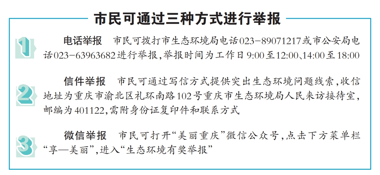 据悉,这是今年以来重庆第二次举行突出生态环境问题有奖举报活动,旨在深入打好污染防治攻坚战,妥善解决人民群众反映强烈的突出生态环境问题,鼓励公众广泛参与生态环境治理,持续改善生态环境质量。