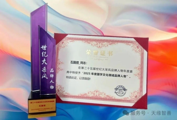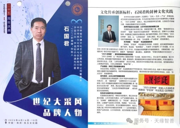 石国君先生在第二十五届世纪大风采品牌人物年度盛典中特授予“2025年度国学文化领域品牌人物”并荣登特刊。