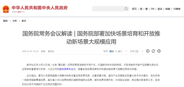 2025年10月31日,国务院常务会议审议通过通过《关于加快场景培育和开放推动新场景大规模应用的实施意见》,这是党的二十届四中全会之后,首次纳入国务院常务会议的一个重磅政策文件,明确提出要“通过场景开放,减少对新业态、新领域的制度约束,开放一些受到监管限制和未被开发的场景资源,在确保安全的基础上允许各类企业参与到新场景的建设中来,推动技术创新成果向产业化应用深度转化”。优先布局一批新领域新赛道场景、高价值小切口场景和跨区域跨领域综合场景"。