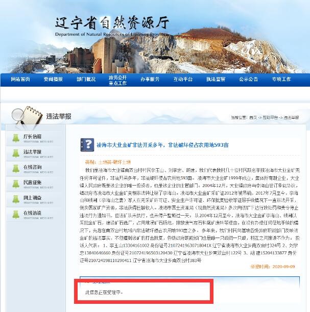 2020年9月初,我们开始通过网络进行信访投诉,凌海市环境保护局、辽宁省自然资源厅也先后受理了我们的投诉,但大业金矿至今仍在非法开采,大业金矿无证无照生产、占用大量耕地、严重破坏生态环境,事实俱在。难道此事就无人敢管,让这个非法企业就这样无法无天了吗?