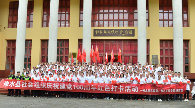6月20日上午,修水县民政局组织全县33家社会组织党组织的200多名党员,开展“一心向党·同庆百年”红色打卡活动,以徒步打卡的方式,追寻修水红色记忆,重温修水光辉历史,根植红色革命信仰,讴歌党的丰功伟绩,扎实开展党史教育,隆重庆祝建党100周年。