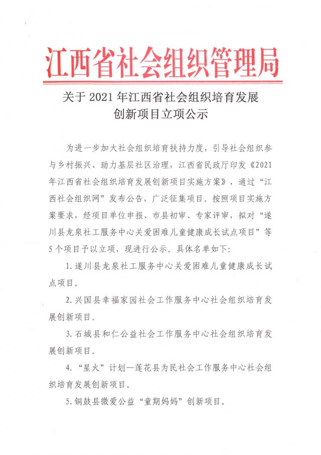 关于2021年江西省社会组织培育发展创新项目立项公示