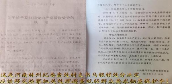 林州市纪委在2013年7月10日印发的《关于给与马银锁党内严重警告处分的决定》·林纪审【2013】号中,已确认了马银锁‘贪污公款7200元,索贿5000元’的事实,但东姚镇纪委2011年9月10日查处收缴的两个【票据】中已明确说明了‘骗取和其他违纪款十六万三仟伍佰元和三万两仟柒佰元的事实,就这两项林州市纪委隐瞒罪证,对于马银锁严重违纪涉嫌犯罪行为只作了一个严重警告处分。