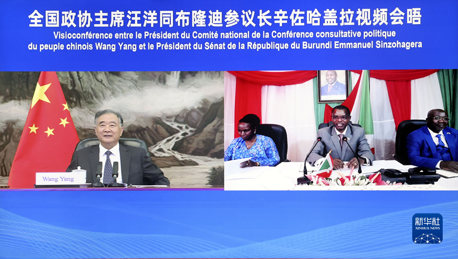 9月13日,全国政协主席汪洋在北京以视频方式会见布隆迪参议长辛佐哈盖拉。 新华社记者 刘卫兵 摄