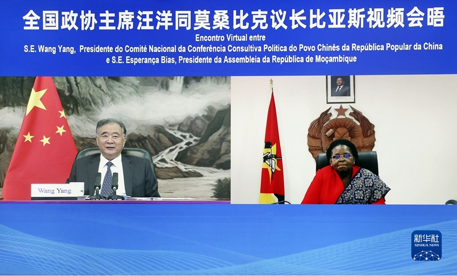 9月13日,全国政协主席汪洋在北京以视频方式会见莫桑比克议长比亚斯。新华社记者 刘卫兵 摄