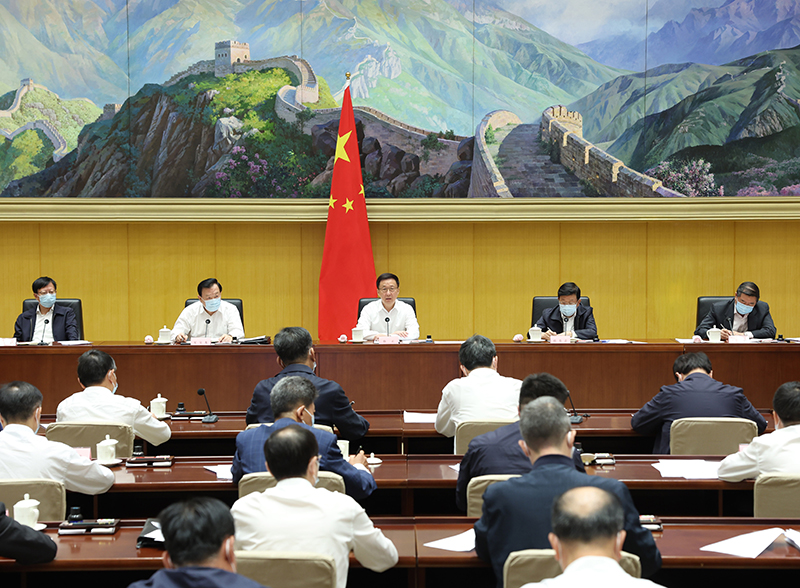 9月23日下午,中共中央政治局常委、国务院副总理、中央港澳工作领导小组组长韩正在北京主持召开视频会议,听取澳门特别行政区行政长官贺一诚关于澳门当前经济形势和有关工作情况的汇报,研究支持澳门加快基础设施建设、推动经济适度多元发展有关工作。新华社记者 王晔 摄