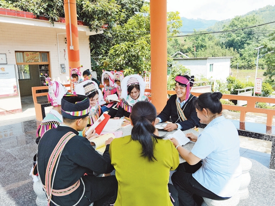 陶文生是县新时代国门实践站的成员之一,负责那布村新时代国门实践站的日常事务。利用村民聚集的有利时机,在升国旗仪式结束后,他通常要开展国旗下的宣讲,今年已经宣讲了23次。陶文生说:“用苗族语言向苗族同胞宣讲党的方针政策,以及乡村振兴、民族团结、防疫措施等一些与老百姓息息相关的惠民政策,让群众听得懂也用得上,同时鼓励和倡导群众持续改善村里的人居环境,共同营造美丽整洁的新风貌。”