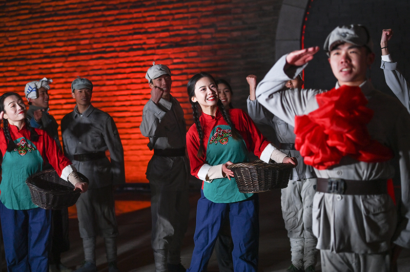 金延安文化旅游产业园的演艺人员在街区表演歌舞《南泥湾》(1月14日摄)。