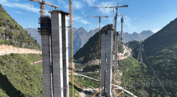 眼下,贵州花江峡谷大桥建设现场一派繁忙(如图)。花江峡谷大桥桥面与谷底的北盘江距离达625米,预计2025年建成。