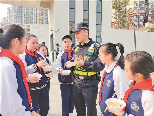 3月2日,南宁市鲁班路小学开展“爱心饺子赠民警”活动,将劳动课程与学雷锋活动结合,把爱心传递给为校园安全无私奉献的巡逻民警。记者 巫美桥红/摄