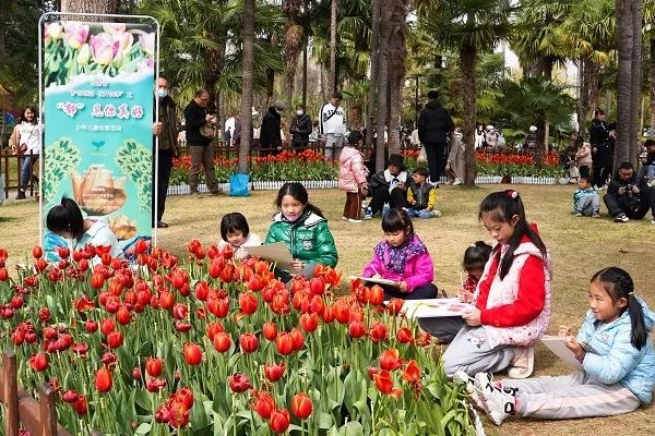 翠湖公园里,阵阵春风吹过,一株株郁金香随风摇拽,让人情不自禁地沉醉其中。孩子们早早来到活动地点,围到花圃旁,观察郁金香的颜色、形状,微微俯身轻嗅花香。随后他们支起画板,调好颜料,用手中的画笔,描绘着自己心中的春天。一幅幅赤橙黄绿五彩缤纷画作跃然纸上,这是孩子们对昆明春日的献礼。