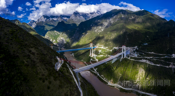 虎跳峡金沙江大桥(右)与雪山交相辉映。