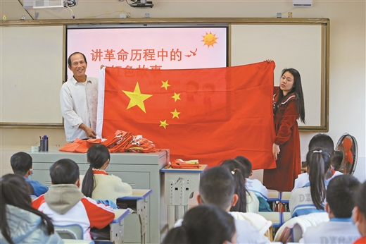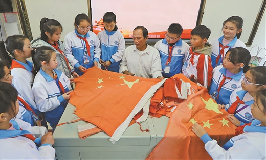 骆文芳在向孩子们讲述他与国旗的故事。这面国旗曾在台风天被大风刮跑,他冒雨将其在海边找回。