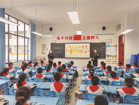 活动中,该局组织志愿者通过班级一体机、学校LED显示屏及学校微信公众号等平台,组织学生集中观看“制止餐饮浪费 青年在行动”宣传视频,引导学校师生学习《中华人民共和国反食品浪费法》,进一步提升师生节约意识。同时,组织志愿者走进课堂与学生面对面交流,向学生们介绍粮食的由来和食品浪费的范畴,带领学生们重温古诗《悯农》,体会粮食的来之不易,并普及正确的生活饮食方式,提醒学生们不挑食、不浪费,做一名合格的粮食守护小卫士。(黄壮 摄)