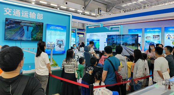 全国科技活动周主场展览设在北京城市绿心森林公园活力汇室内和室外空间,观众走到交通运输部展区,了解交通运输领域高速铁路、桥梁建造、智慧港口、作业装备等方面的典型创新成果(如图)。