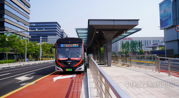 日前,在上海虹桥火车站附近的绍虹路公交站,一辆71路中运量公交车缓缓驶来,开启该线路西延伸段空载联调联试(如图)。