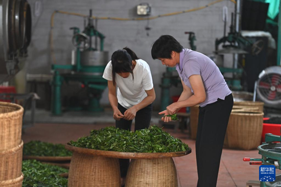 6月7日,在苍梧县六堡镇山坪村,祝雪兰(右)在制茶。