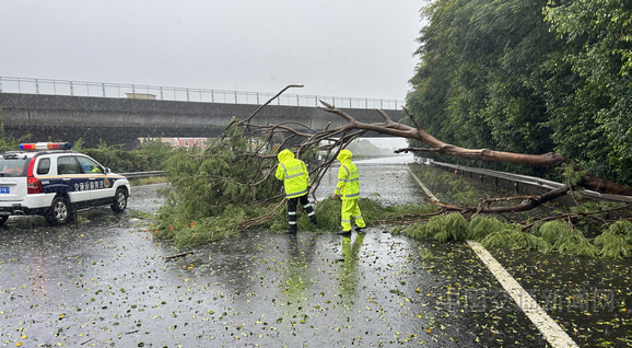 7月28日,厦门高速执法支队执法员冒雨在沈海高速公路清理被吹倒的凤凰树。