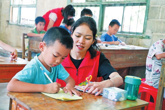 在驮堪乡启新村文明实践站,由该村18名返乡大学生组成的志愿服务队正在开展“大手拉小手 传递知识力量”主题志愿服务活动,志愿者们对防溺水、安全用电、反邪教等知识进行讲解,切实增强学生的安全意识。(黄丽葵)