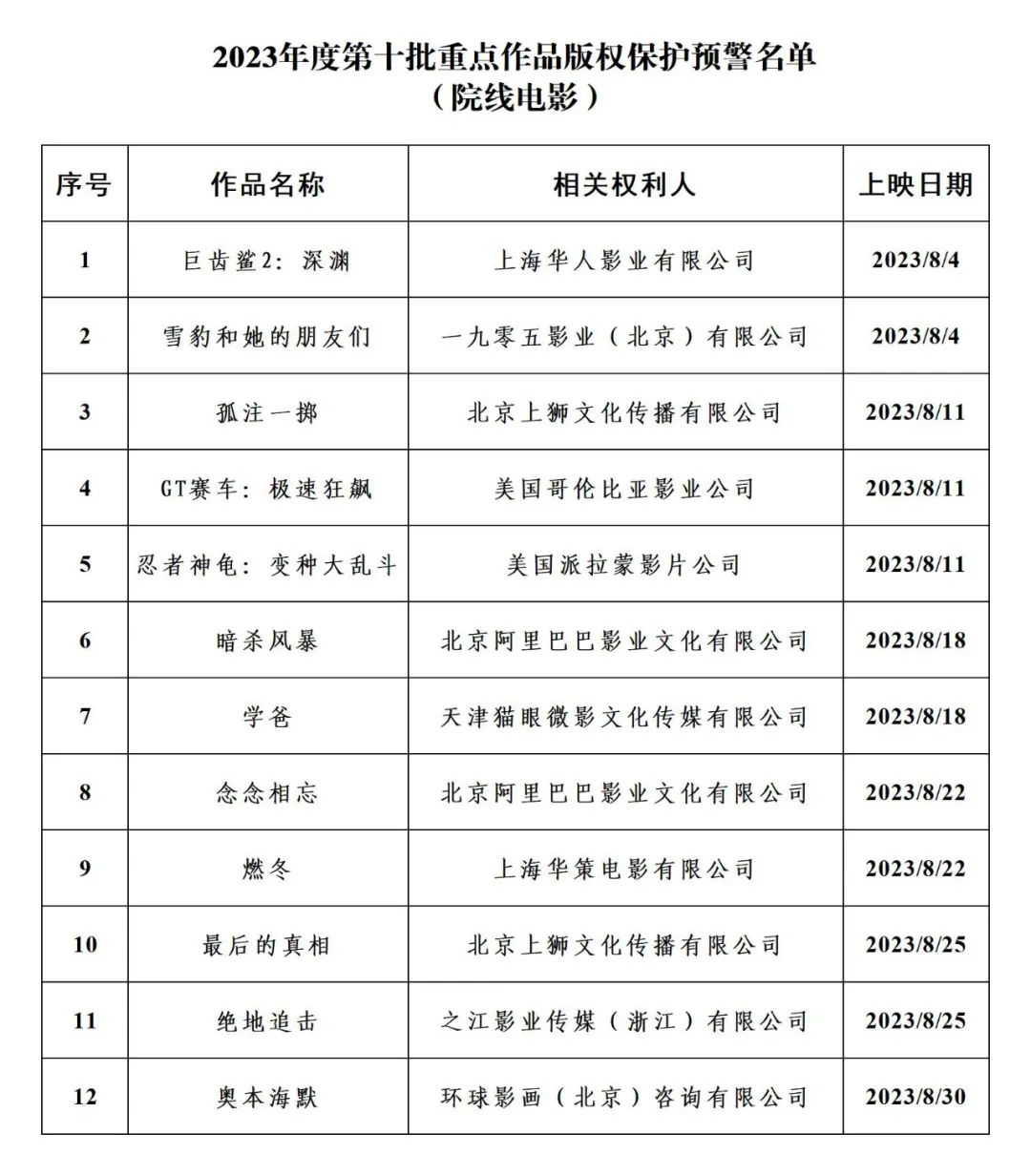 按照国家版权局《关于开展院线电影版权保护专项工作的通知》《关于进一步加强互联网传播作品版权监管工作的意见》及版权重点监管工作计划,根据相关权利人上报的作品授权情况,现公布2023年度第十批重点作品版权保护预警名单。