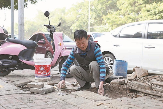 11月20日上午,正在金海公园附近散步的李启高,又寻到一处“维修点”。回家拿上工具和材料后,他匆匆赶回公园,维修破损的路面。他熟练地舞动着手里的工具,半个小时后,地砖终于修补好,看着平坦的路面,他脸上露出了满意的笑容。