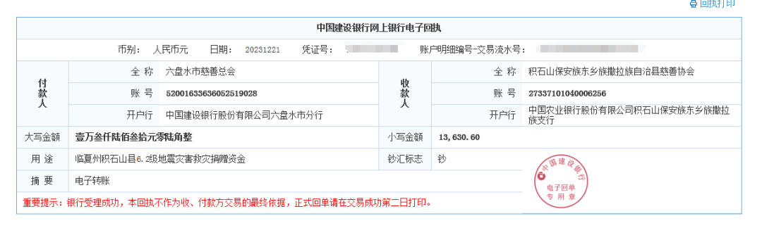 北京时间12月18日23时59分,甘肃临夏州积石山县发生6.2级地震。突如其来地震灾害造成重大人员伤亡和水、电、交通、通讯等基础设施严重受损。一方有难,八方支援。此次地震灾情牵动着全国人民的心,大灾面前有大爱,为保障灾区群众基本生活,帮助灾区群众尽早渡过难关,恢复正常生产生活秩序,六盘水市慈善总会决定将“贵州省第十届慈善项目推介会义卖活动”义卖款13630.6元,全部捐赠给积石山保安族东乡族撒拉族自治县慈善协会,用于帮助受灾群众度过难关。温暖无惧山海,爱心跨越千里。爱心款虽然不多,却凝聚着中国凉都·六盘水热心公益爱心企业、爱心人士的片片“善心”和浓浓“爱心”,希望爱心能跨越千里,滴水成河,聚沙成塔,尽快为灾区受灾群众送去温暖和关心,帮助他们战胜困难、渡过难关、凝心聚力、重建家园。