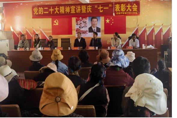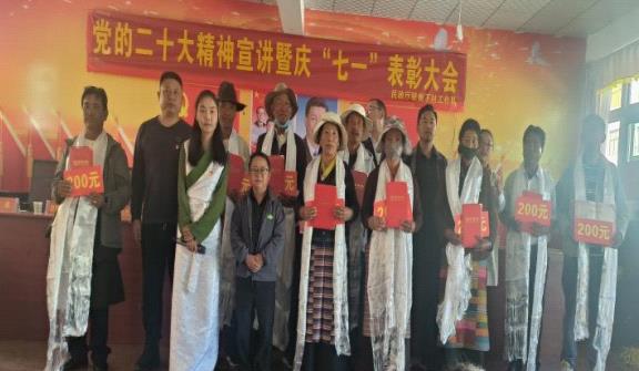 近期,自治区民政厅驻曲下村工作队开展了党的二十大精神宣讲暨“树榜样 争先进”表彰大会隆重庆祝中国共产党成立102周年,拉孜县、曲下镇党建工作负责同志、曲下村党员及农牧民群众200余人参加了活动。