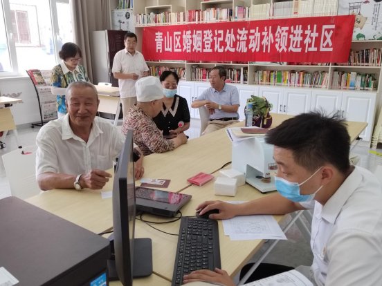 青山区婚姻登记处自2021年开始面向全区老年人集中受理补领结婚登记。“关注民生、下沉服务”走乡村进社区,为结婚证丢失、损毁,结婚证信息不符的老年人开展流动补领服务。利用休息日与偏远社区进行结对服务,租赁大巴车将老人统一接送到登记处集中受理。近两年的时间受理补领登记约3000余对。举办金婚老人集体庆典、金婚老人访谈、党员夫妻共度主题党日、传承好家风、好婆婆好儿媳评选等主题活动10余场。