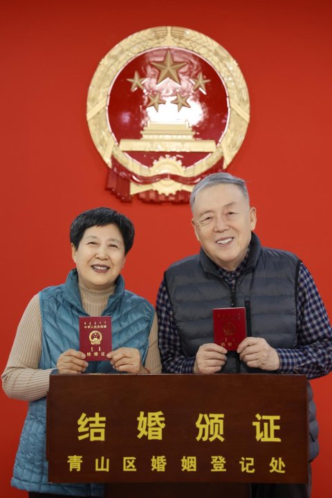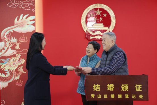 五十年的牵手,弹指一挥间。18250个日夜风风雨雨同舟共济,半个世纪朝朝暮暮相依扶持。在青山区婚姻登记处登记员为一对古稀老人补领结婚证,当得知二位老人值此金婚之年,便特别为他们举行了一次浪漫温情的结婚颁证仪式。颁证厅庄严神圣的国徽见证了二老五十载感情历程的幸福和甜蜜、五十载婚姻生活的平凡和不易。光阴似水两鬓白,齐眉伉俪情意深。当颁证师将一对新式的结婚证郑重地颁发给二老时,两位老人慈祥而幸福的笑容真正诠释了生死契阔,与子成说,执子之手,与子偕老的真谛。