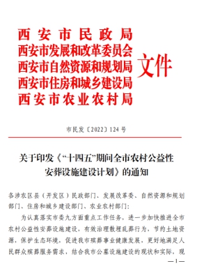 (二)深化殡葬改革,推动城乡公益性殡葬设施建设。为进一步推进城乡公共服务体系建设,满足城乡居民文明治丧需求,切实保障人民群众基本殡葬权益。2021年,市民政局联合市发改委等5部门印发了《关于推进城乡公益性殡葬建设实施意见的通知》,要求在全市火葬区范围内,合理布局殡仪服务机构,满足全市群众殡葬服务需求,切实保障人民群众基本殡葬权益,加大城乡公益性殡葬设施建设力度,实现城乡居民基本殡葬服务均等化、殡葬设施现代化、殡葬管理法制化、骨灰处理生态化和殡葬习俗文明化。2022年,为加快推进全市农村公益性安葬设施规划建设,市民政局联合市级相关部门相继印发了《关于推进农村公益性安葬设施建设的通知》《关于下达“十四五”期间全市农村公益性安葬设施建设计划的通知》等文件,按照“先行试点,逐步推广”的原则,有计划有步骤的推进农村公益性安葬设施建设,并结合《西安市殡葬设施专项规划(2021-2035年)》,实现全市农村公益性骨灰堂全覆盖的目标。