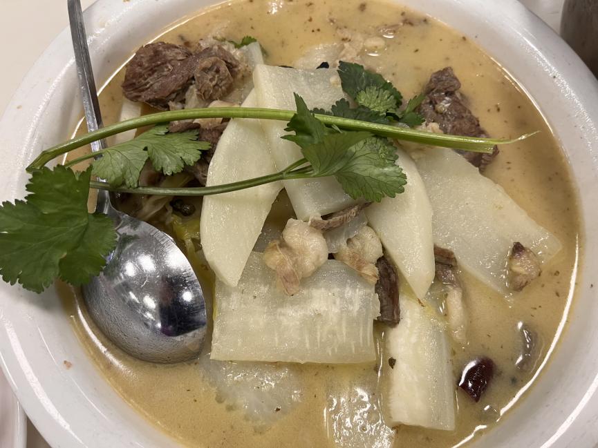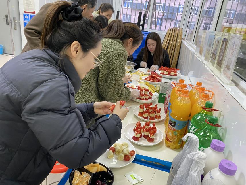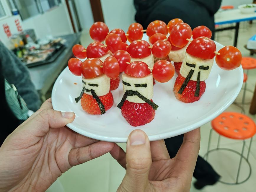 下半场工会活动,大家“转战”学校食堂,自己动手、丰衣足食。辣子鸡、糖醋排骨、羊肉炖萝卜、毛血旺、草莓香蕉财神、猪肉白菜饺…… 平时工作中的同事们纷纷展现出厨艺高超的一面,令人惊叹不已。大家分工合作,切菜声、蒸炖声、翻炒声交织,一道道美味佳肴陆续上桌,令人“烹燃”心动。
