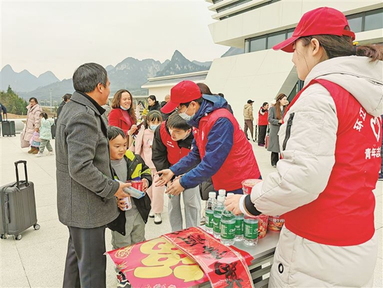 在贵南高铁环江站,志愿者为旅客发放小礼品、饮用水等。