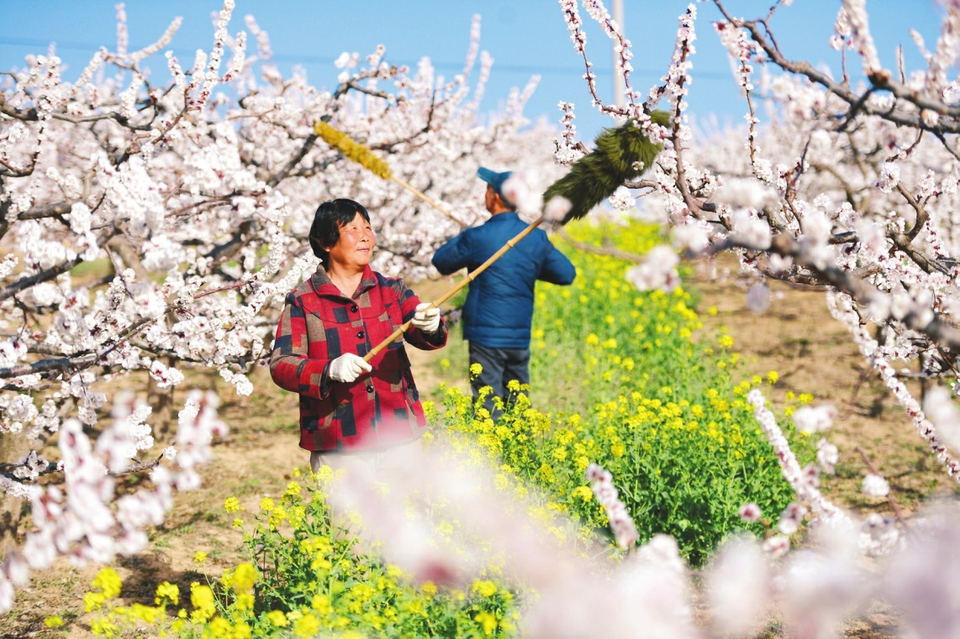 3月19日,永济市韩阳镇长旺村杏园里,杏农正在对杏花进行授粉作业。李向东摄