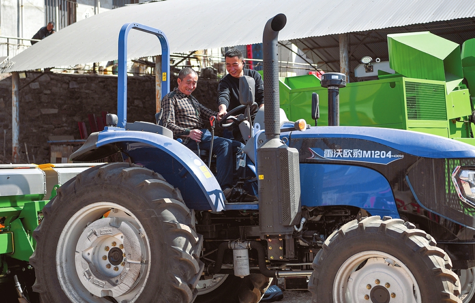 3月23日,临汾市古县旧县镇金红农机市场内,农机手在销售人员的指导下挑选拖拉机。闫锐鹏摄