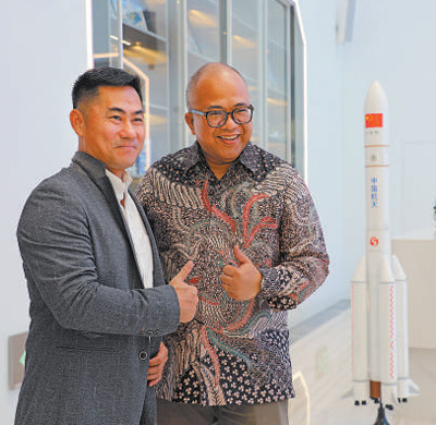 在文昌航天超算中心,印尼驻华公使裴连杰(右)同中方人员于火箭模型前合影留念。