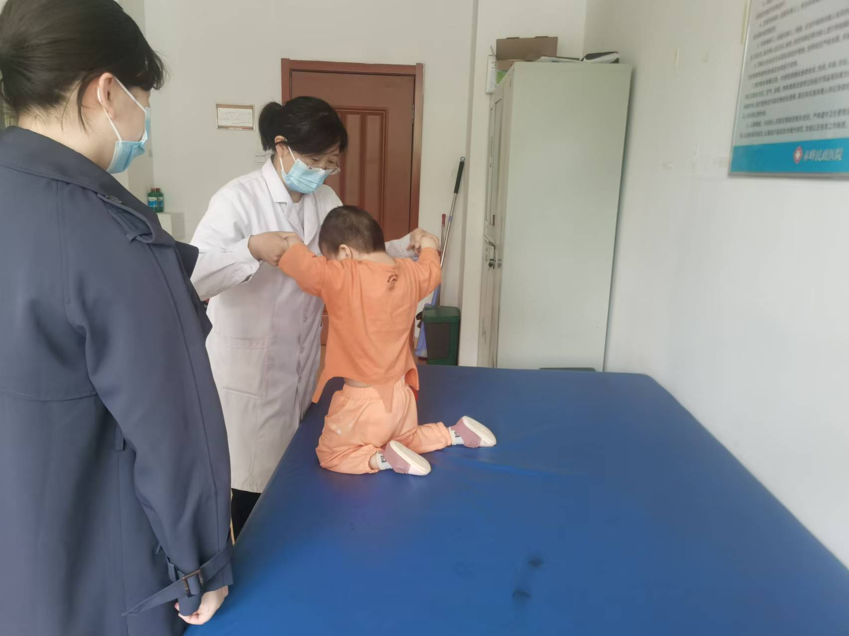 (民政医院医师对儿童家长进行康复指导和儿童身体机能评估)