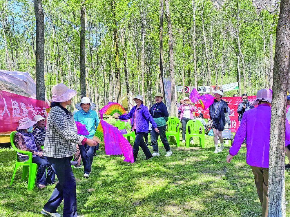 晌午过后,林地的树荫下响起了欢快的旋律,老人手持花扇,跳起了舞蹈,欢度端午。