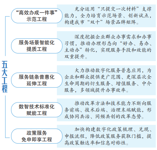 下一步,沈阳市将全面落实国家、省关于推动“高效办成一件事”的部署要求,以数源治理、场景建设等“数据业务化”的改革创新工程为重点,建设“事项标准化更优、数据共享度更优、业务协同性更优、服务体验感更优”的“四个更优”标准,围绕打造“办事满意之城”的核心目标,重点开展“五大工程”。