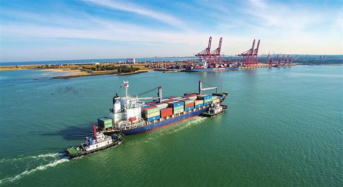 洋浦经济开发区依托洋浦港,抢抓自贸港建设、西部陆海新通道等国家战略实施的重大机遇,以高水平开放引领高质量发展。图为外贸轮船正在驶进洋浦港。陈元才 摄