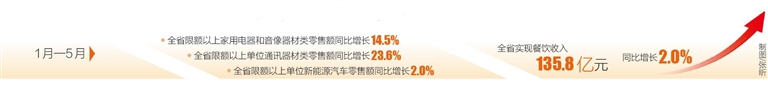 在餐饮消费领域,我省越来越多餐饮企业通过线上平台开展促销宣传,保持餐饮收入稳定。1月—5月,全省实现餐饮收入135.8亿元,同比增长2.0%,其中限额以上单位外卖送餐服务收入同比增长18.0%。