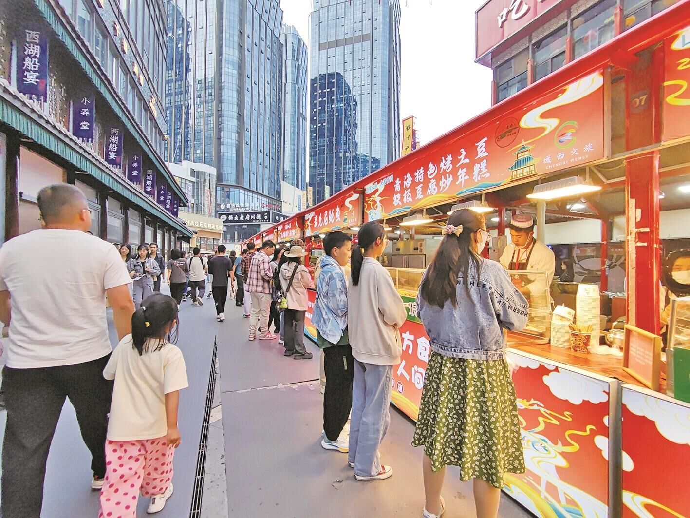 游客在唐道·637广场美食街区购买美食。6月28日晚,西宁市海湖新区唐道·637广场美食飘香,人头攒动,热闹非凡。由西宁市人民政府主办,西宁市文化旅游广电局、城西区人民政府承办的,以“悦享河湟漫游夏都”为主题的2024西宁河湟文化旅游节暨第六届西宁美食季活动在唐道·637锅庄广场拉开帷幕。