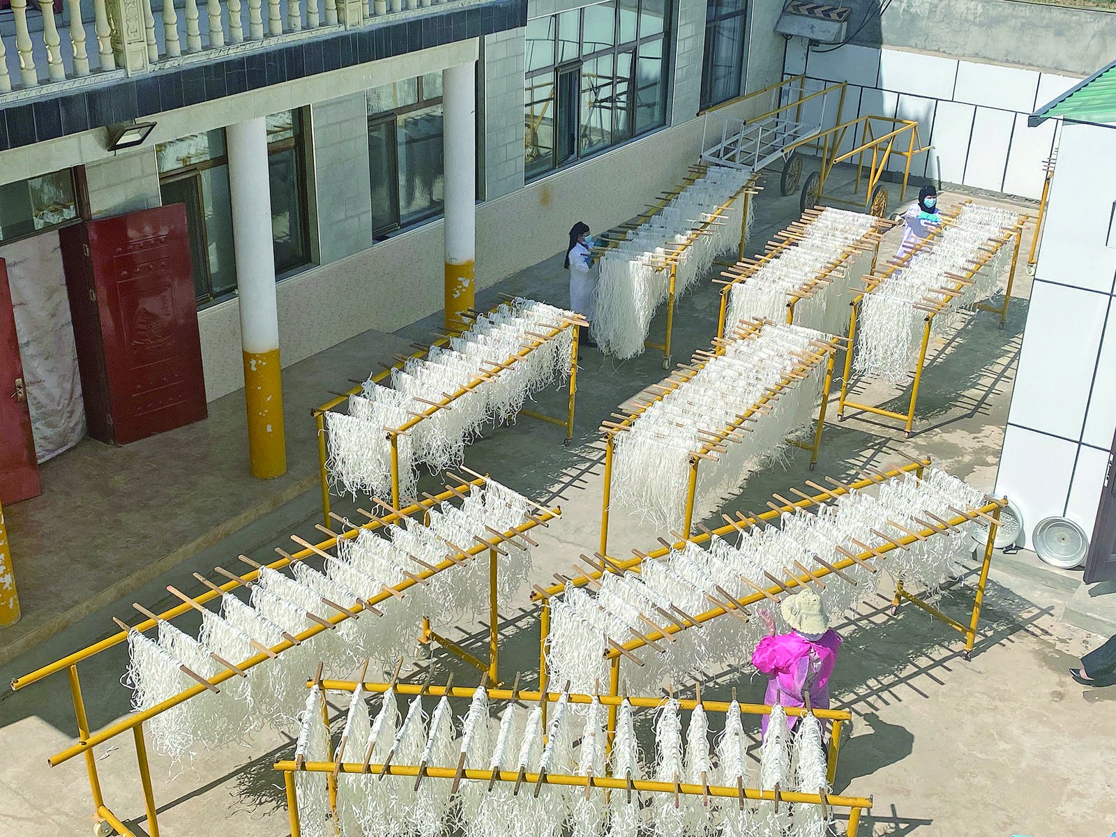 “我在这里工作,主要负责捞粉、晾晒等工作,工作轻松不说,每天能有收入,在家门口就能挣到钱,真不错。”正在晾晒粉条的村民韩秀梅笑意盈盈,她的老伴儿常年在外打工,她就来这里上班了,平时还能在家帮着儿子儿媳带带小孙子。